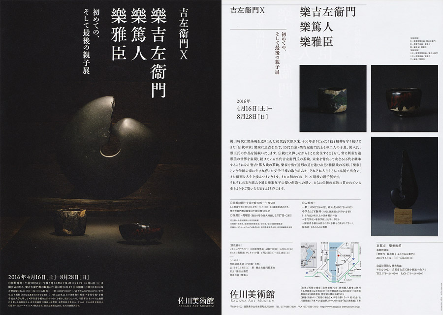 | 2016/04/10 | 2016年 親子展 吉左衞門X 樂吉左衞門 樂篤人 樂雅臣 初めての、そして最後の親子展 開催期間 2016年4月16-8月28日 開催場所 佐川美術館 http://www.sagawa-artmuseum.or.jp/ |